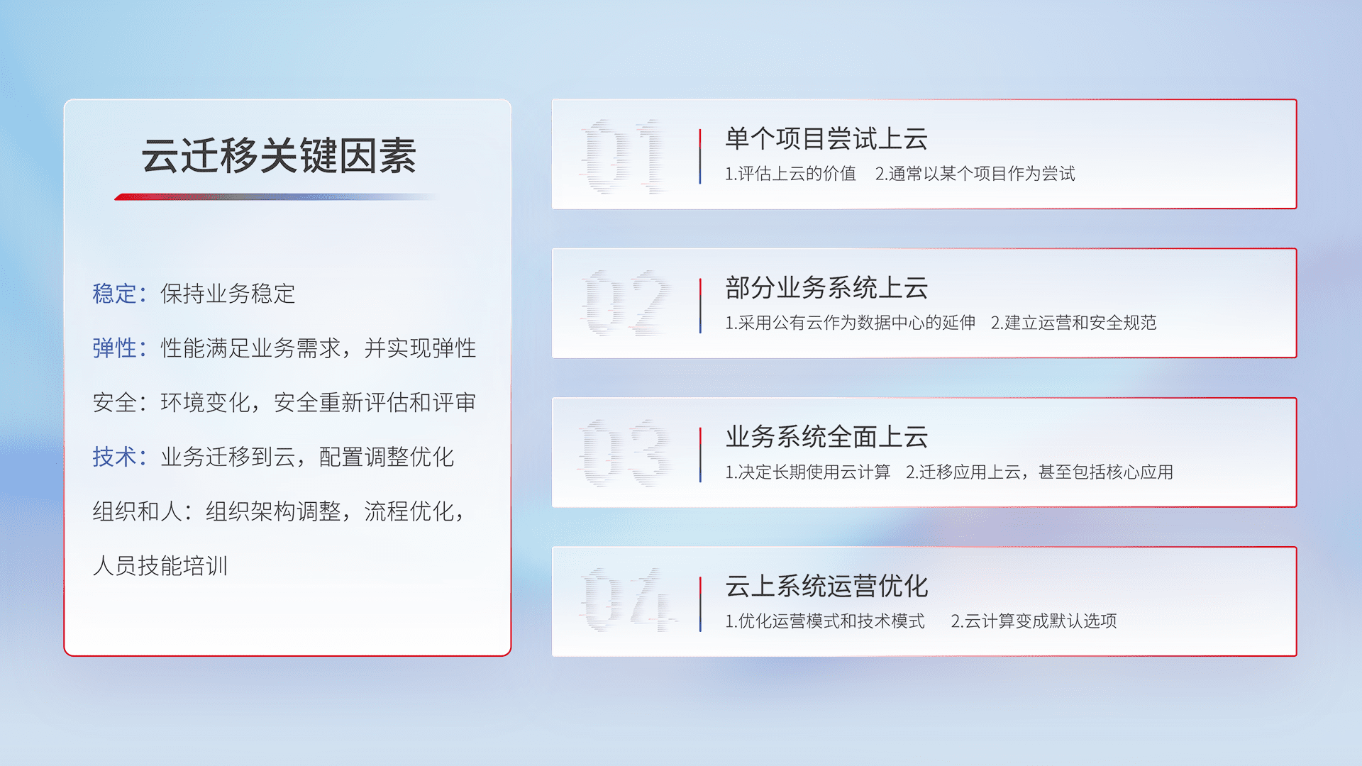 结合实际业务,,,,从规划设计、、、、云平台选型、、、、云原生改造、、数据迁移、、集成交付,,,,迁移全过程为客户识别最佳上云路径,,做好风险识别管理,,,设计网络架构、、身份权限、、安全审计合规、、、操作审计、、日志审计、、、、监控告警策略、、、多站点容灾设计等,,,,对云上基础设施进行整体规划,,提升IT治理水平,,以满足弹性、、、高可用、、、、高性能的需求。。