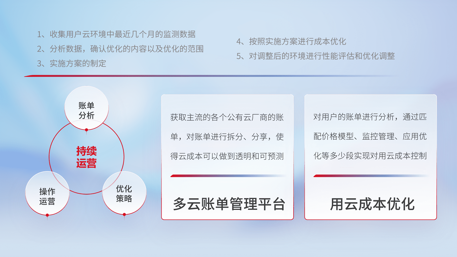 通过多云纳管,,,,以统一的资源数据模型把客户的云资源进行抽象和封装,,进而实现对多云资源的统一操作,,,,保障云资源管理的可靠性、、、、稳定性与可用性。。。量身定制化运维内容,,,配置、、、开发运维、、补丁管理、、、备份、、、监控、、、认证和访问管理、、审计和日常巡检等,,,保障在用云过程中的可靠度,,稳定度以及高可用率。。